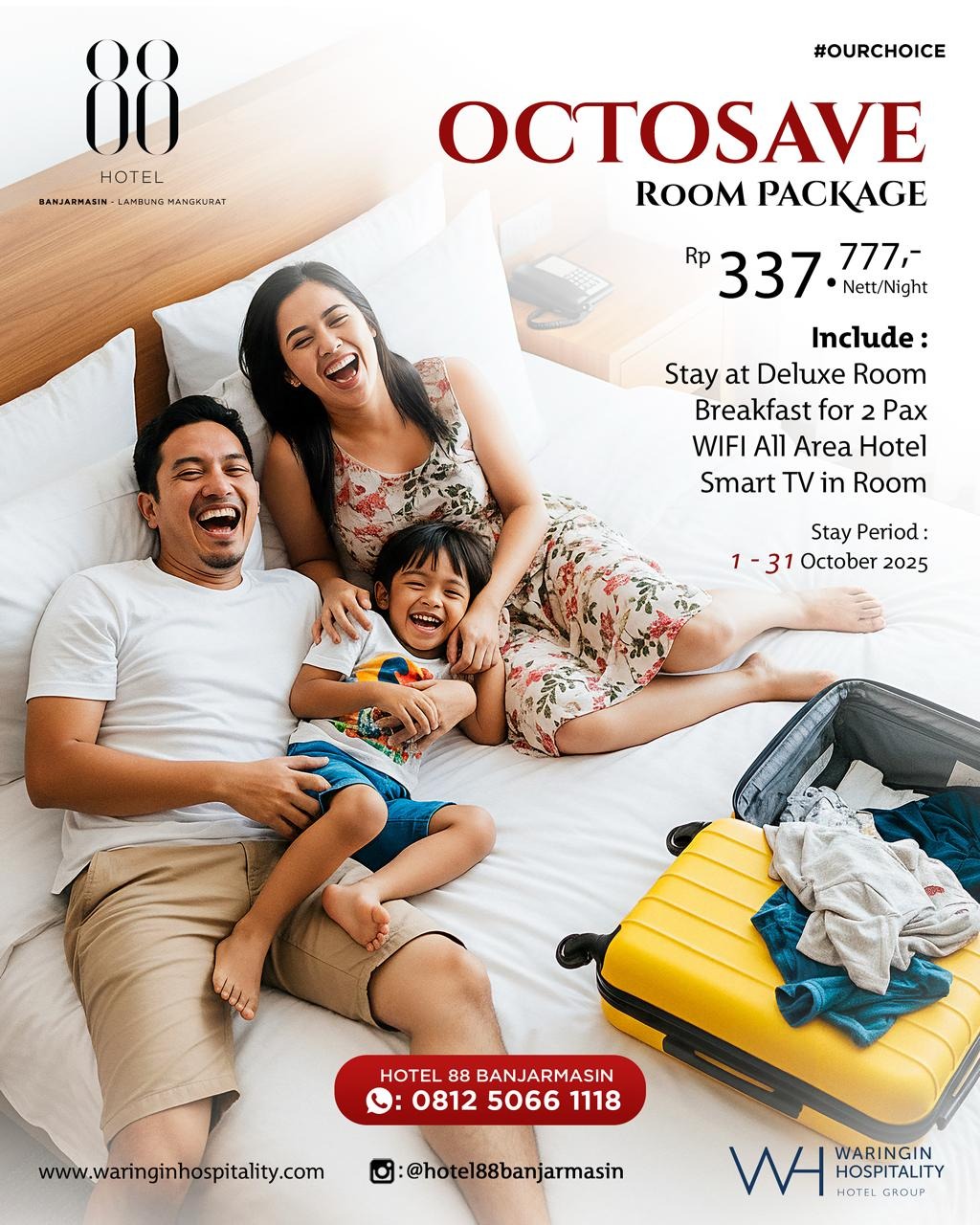 “Promo Octosave Room Package ini kami hadirkan untuk memberikan nilai lebih kepada tamu, baik yang datang untuk bisnis, keluarga, maupun wisata. Kami ingin Hotel 88 menjadi rumah nyaman bagi siapa pun yang datang ke Banua,” tutup Novita.